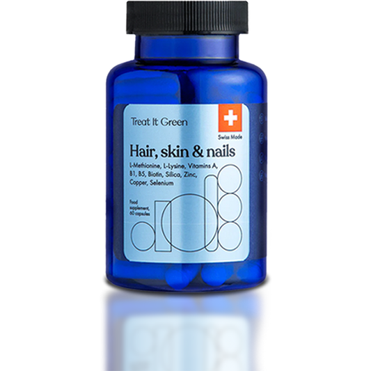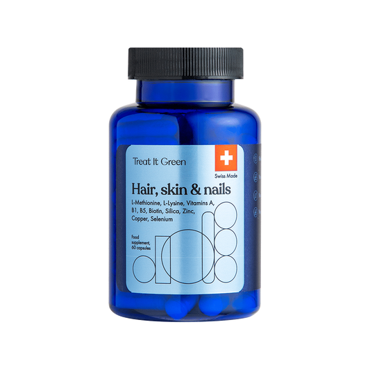 Treat It Green „Hair, skin & nails“ pakuotėje yra 60 kapsulių, o tai sudaro 1 mėnesio kursą. Kapsules vartoti rekomenduojame kasdien, 2 kapsules užgeriant 1 stikline vandens. Prieš vartojant šį arba bet kurį kitą maisto papildą rekomenduojame pasikonsultuoti su savo šeimos gydytoju.