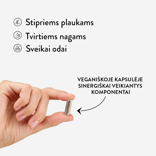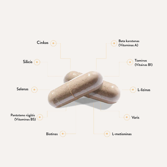 L-lizino hidrochloridas, L-metioninas, stabilizatorius hidroksipropilmetilceliuliozė (veganiškas kapsulės apvalkalas), standartizuotas dirvinių asiūklių (Equisetum arvense) žolės sausasis ekstraktas, beta karotenas, kalcio D-pantotenatas, tiamino hidrochloridas, cinko pikolinatas, selenas (lipnumą reguliuojanti medžiaga dikalcio fosfatas, L-selenometioninas), lipnumą reguliuojanti medžiaga mikrokristalinė celiuliozė, vario gliukonatas, D-biotinas.